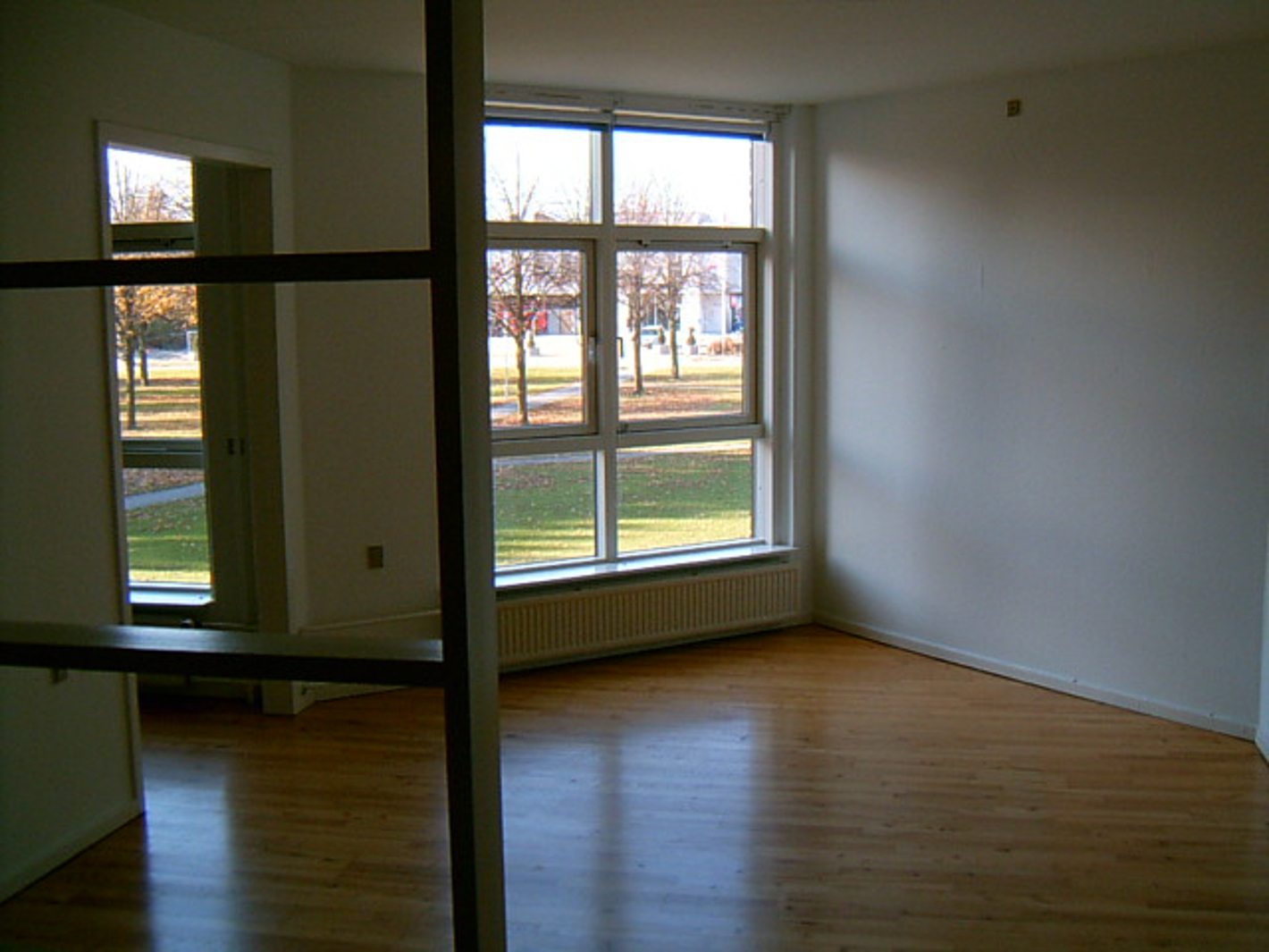 Opholdsstuen er stor nok til, at der er plads til både sofagruppe, tv og en reol samtidig med, at en el-kørestol kan vende.