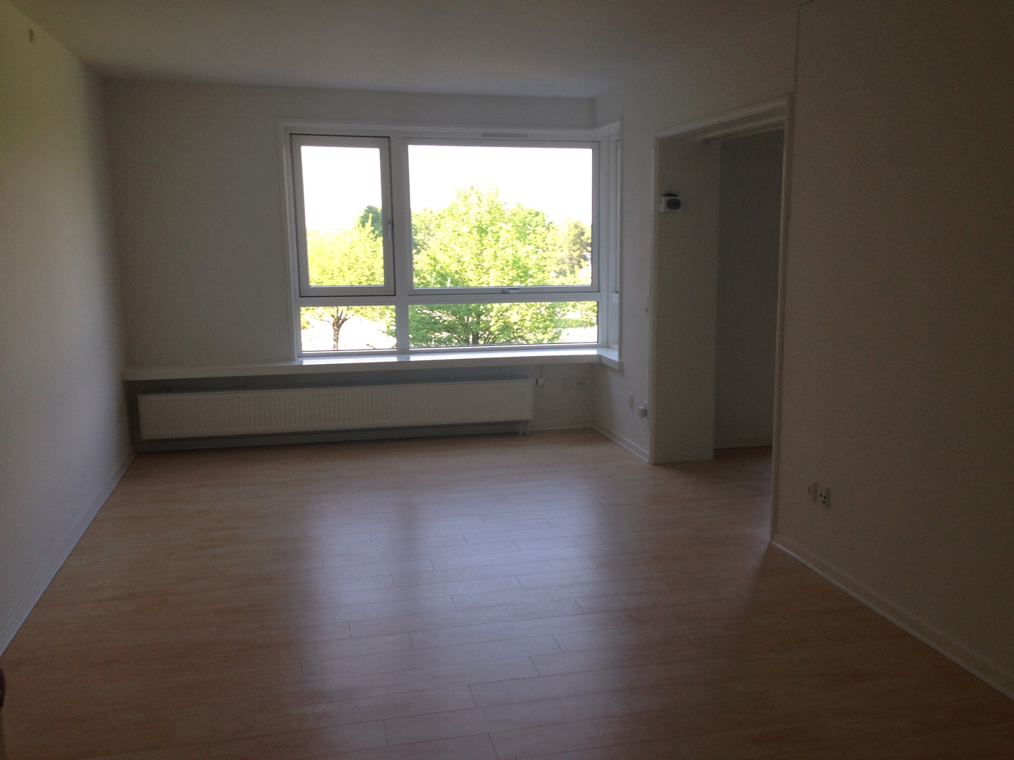 Opholdsstuen har en størrelse hvor der er plads til sofagruppe, tv og en reol.