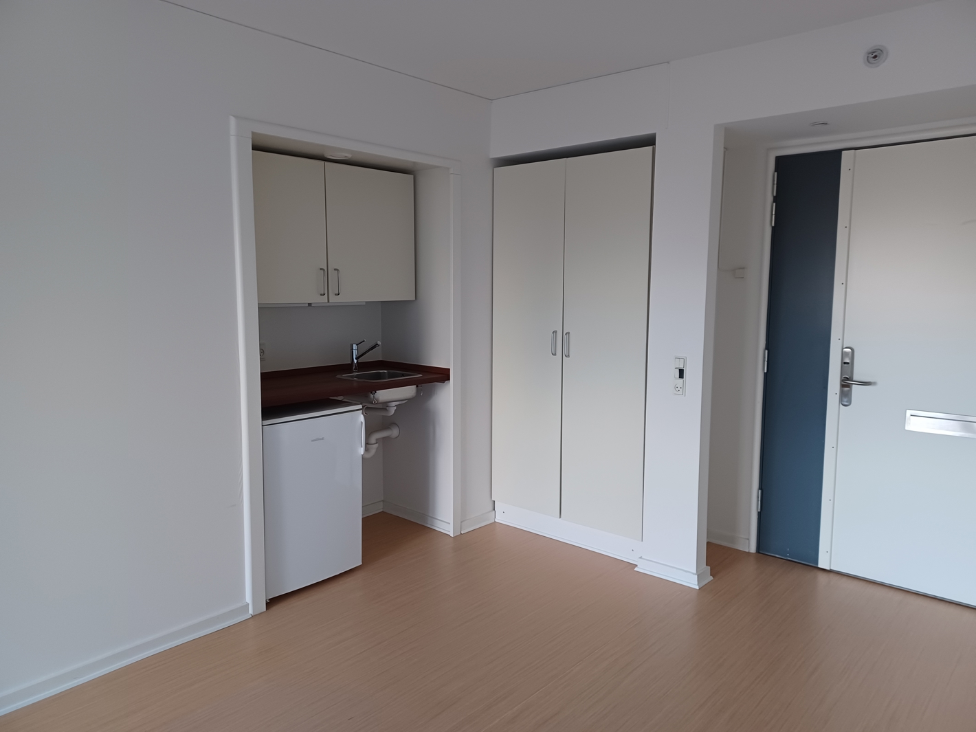 Trinettekøkken med køleskab og overskabe er diskret placeret bag skabslåger i opholdsstuen